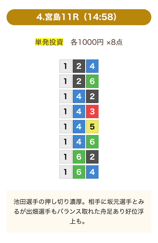 | 8月12日 | 宮島8R | 三連単 | 8点 | 13,500円 |
