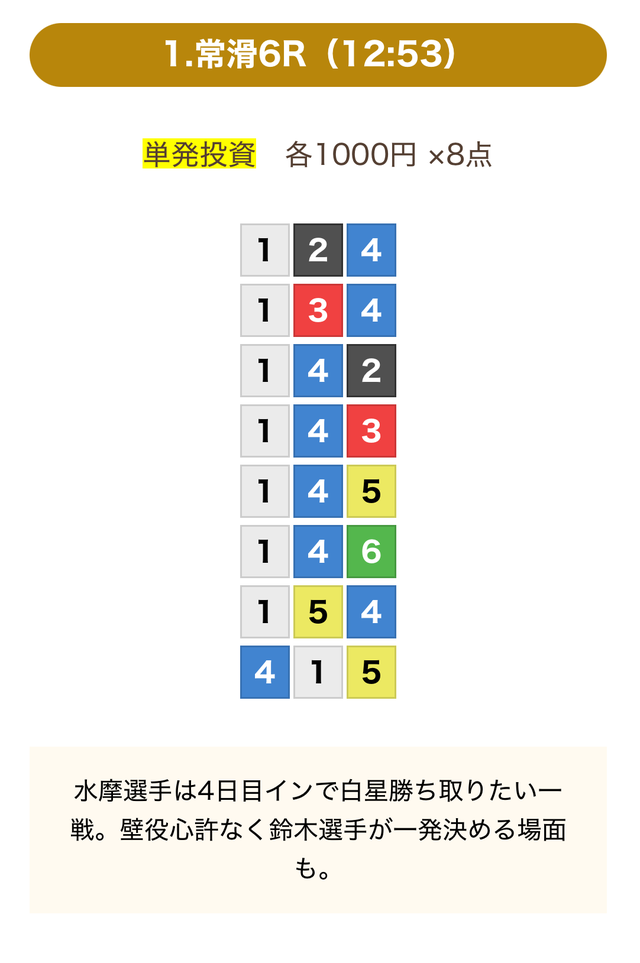 | 12月16日 | 常滑6R | 三連単 | 8点 | 0円 |