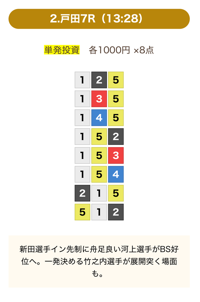 | 10月15日 | 徳山12R | 三連単 | 8点 | 14,500円 |