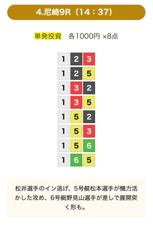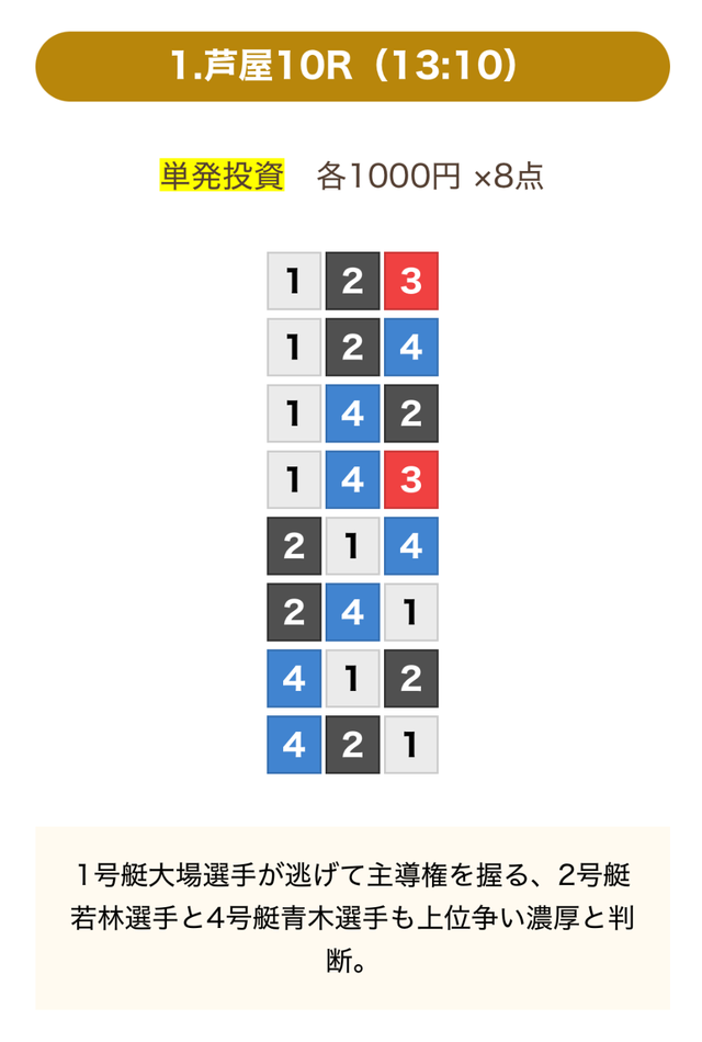 | 8月16日 | 三国10R | 三連単 | 8点 | 12,000円 |