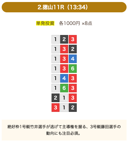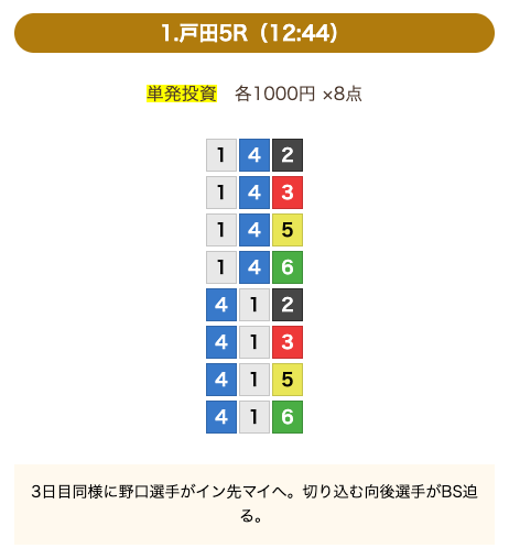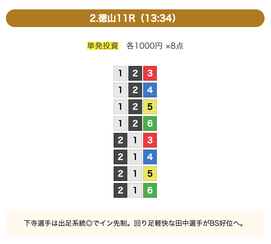 | 25年12月4日 | 徳山11R | 三連単 | 8点 | 16,700円 |