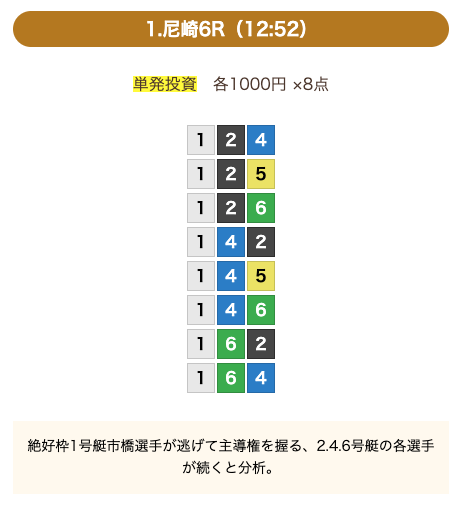 | 26年1月20日 | 尼崎9R | 三連単 | 8点 | 10,000円 |