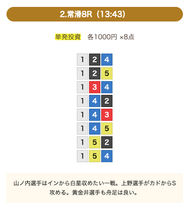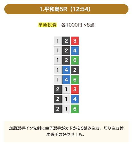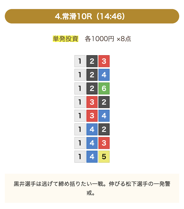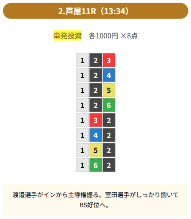 | 25年11月12日 | 三国12R | 三連単 | 8点 | 25,200円 |