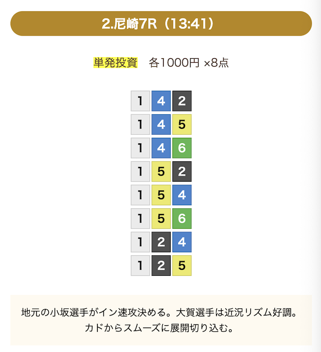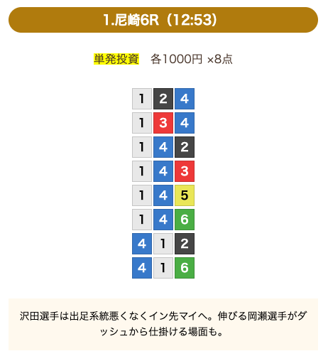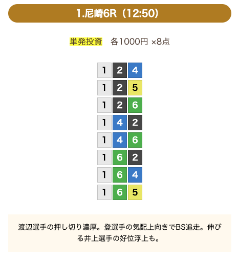 | 26年3月25日 | 尼崎7R | 三連単 | 8点 | 11,700円 |