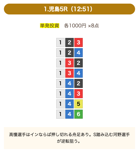 | 26年1月23日 | 児島6R | 三連単 | 8点 | 35,000円 |