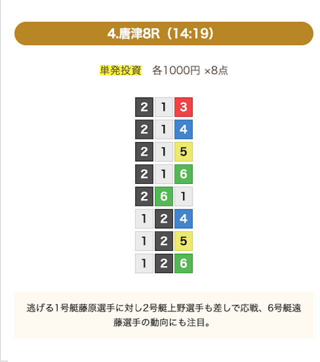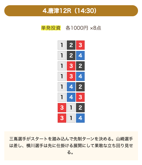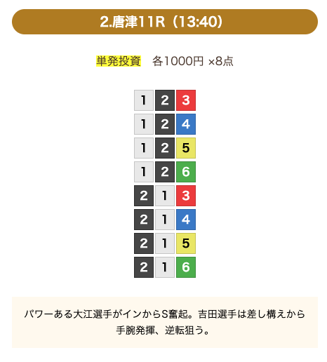 | 26年3月17日 | 唐津8R | 三連単 | 8点 | 15,200円 |