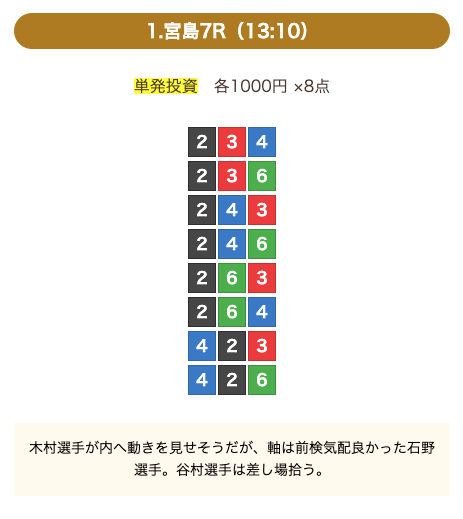 | 26年2月20日 | 宮島7R | 三連単 | 8点 | 11,000円 |