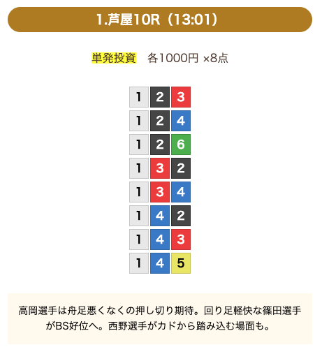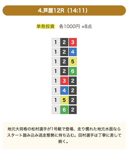| 26年2月26日 | 芦屋10R | 三連単 | 8点 | 12,000円 |