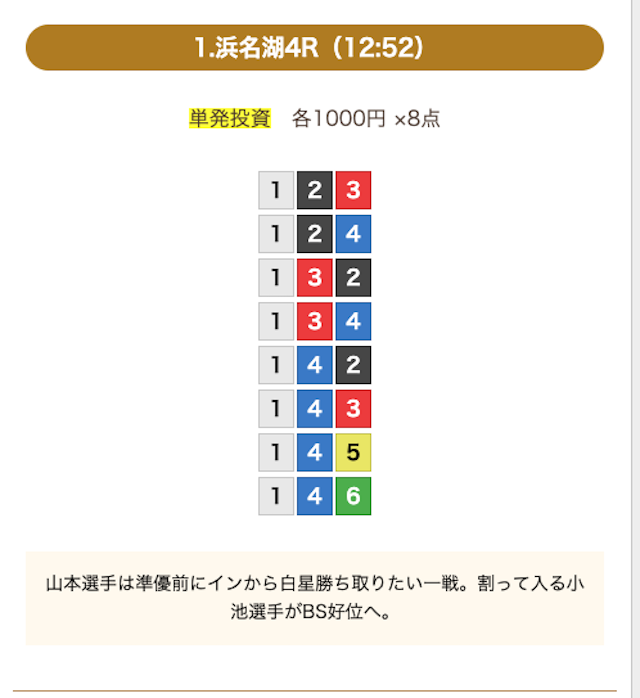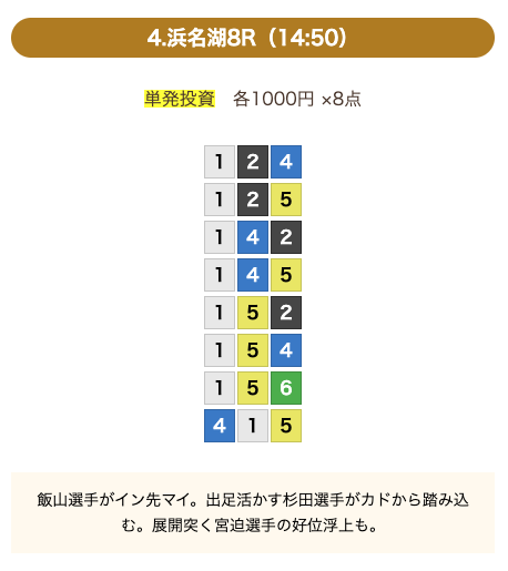 | 26年3月16日 | 浜名湖4R | 三連単 | 8点 | 11,800円 |