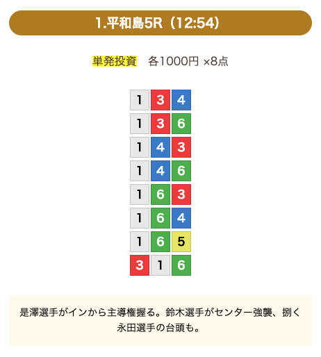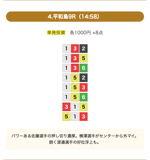 | 26年3月5日 | 平和島5R | 三連単 | 8点 | 8,000円 |