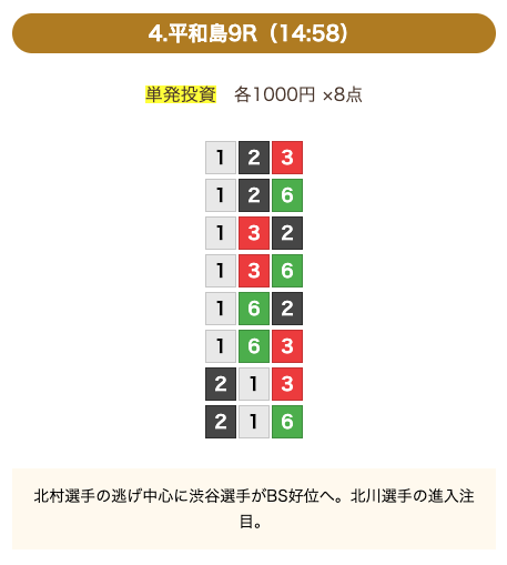 | 26年3月10日 | 平和島9R | 三連単 | 8点 | 18,100円 |
