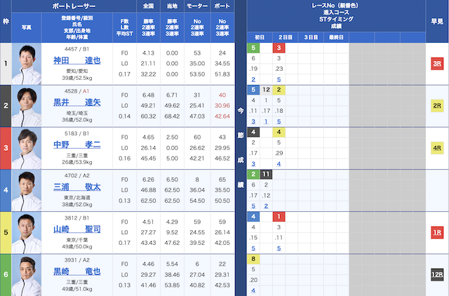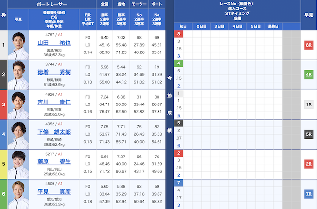 | 枠番 | 選手 | コース | モーター | 勝率 |