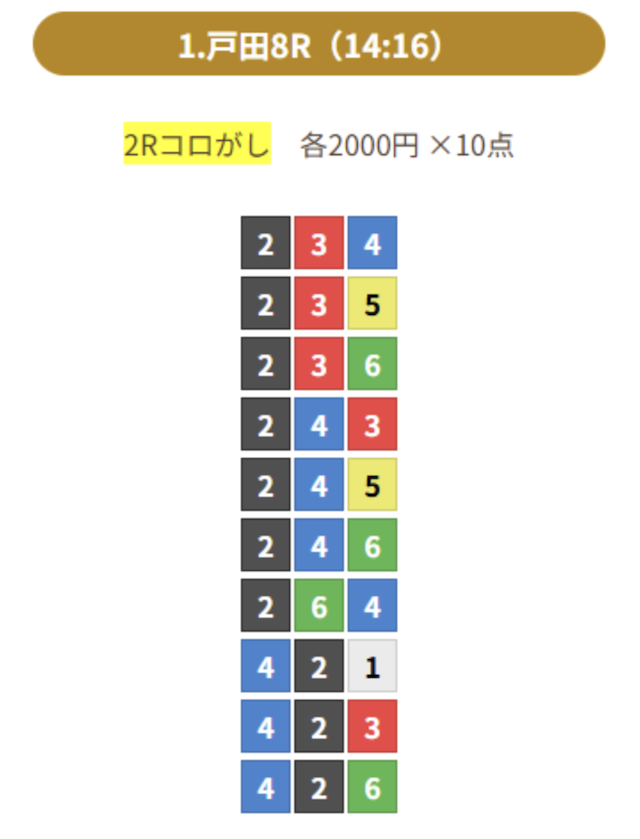 投資金額は1レース目の払戻金293,600円を均等に分配し、一点あたり36,700円購入。