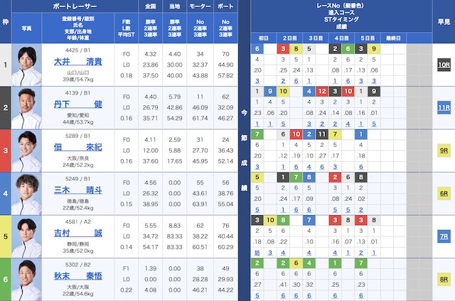 | 枠番 | 選手 | コース | モーター | 勝率 |