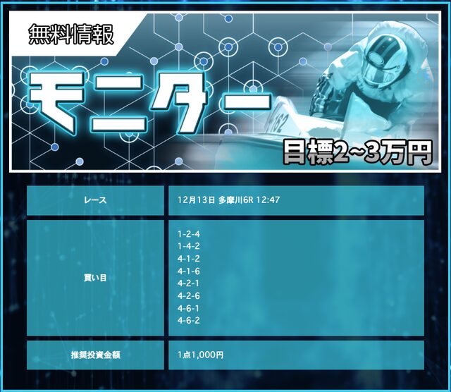 | 12月13日 | 多摩川6R | 三連単 | 8点 | 9,700円 |