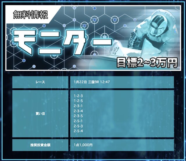 | 1月22日 | 三国9R | 三連単 | 8点 | 14,700円 |