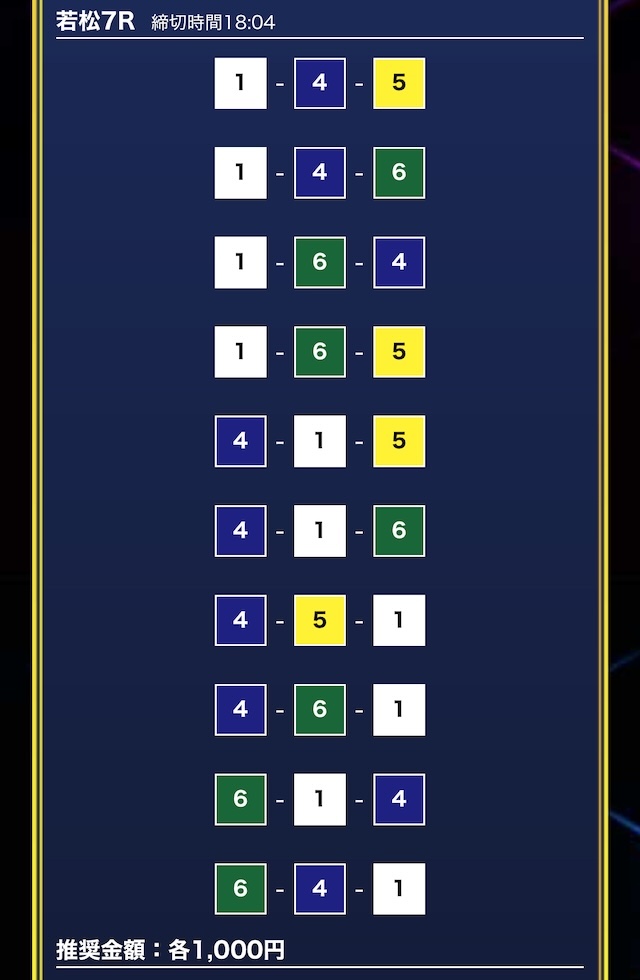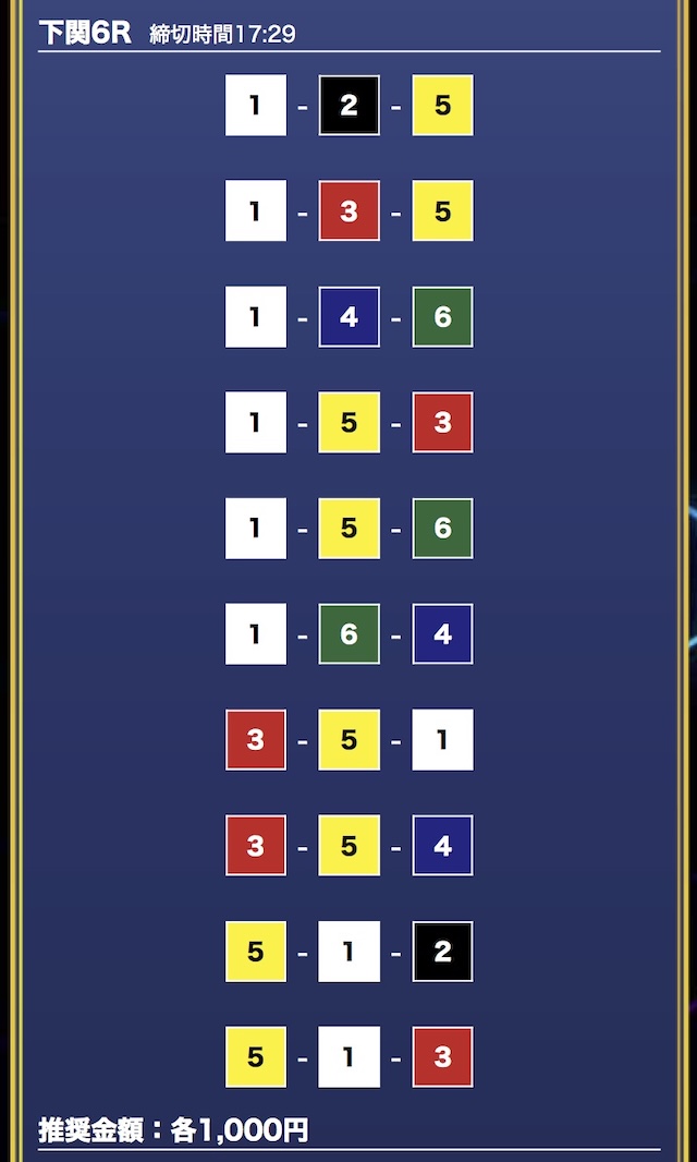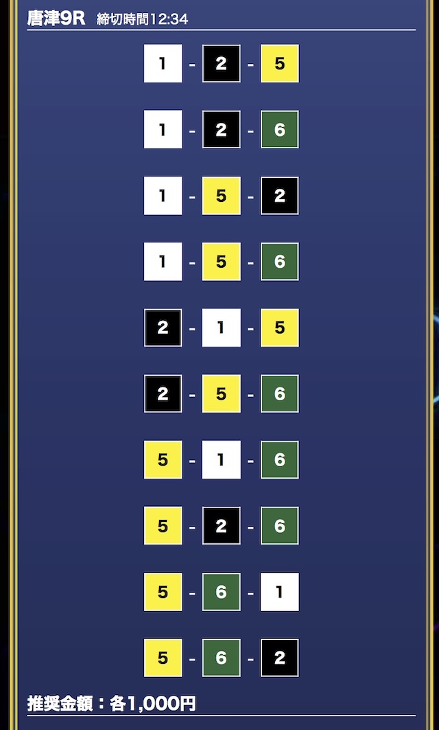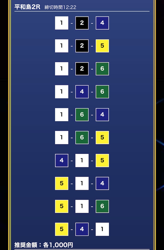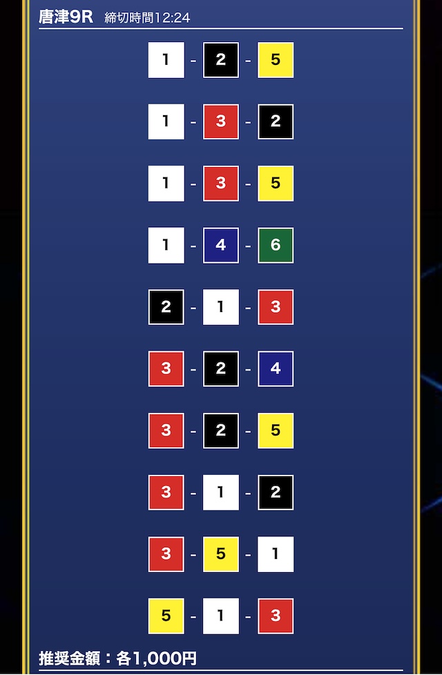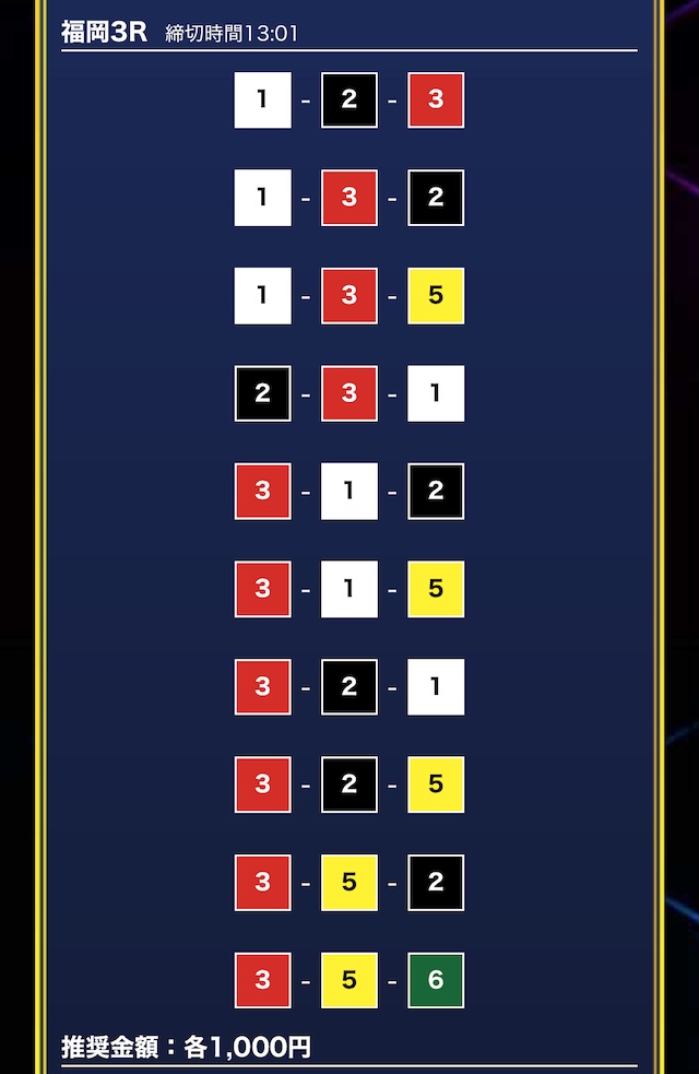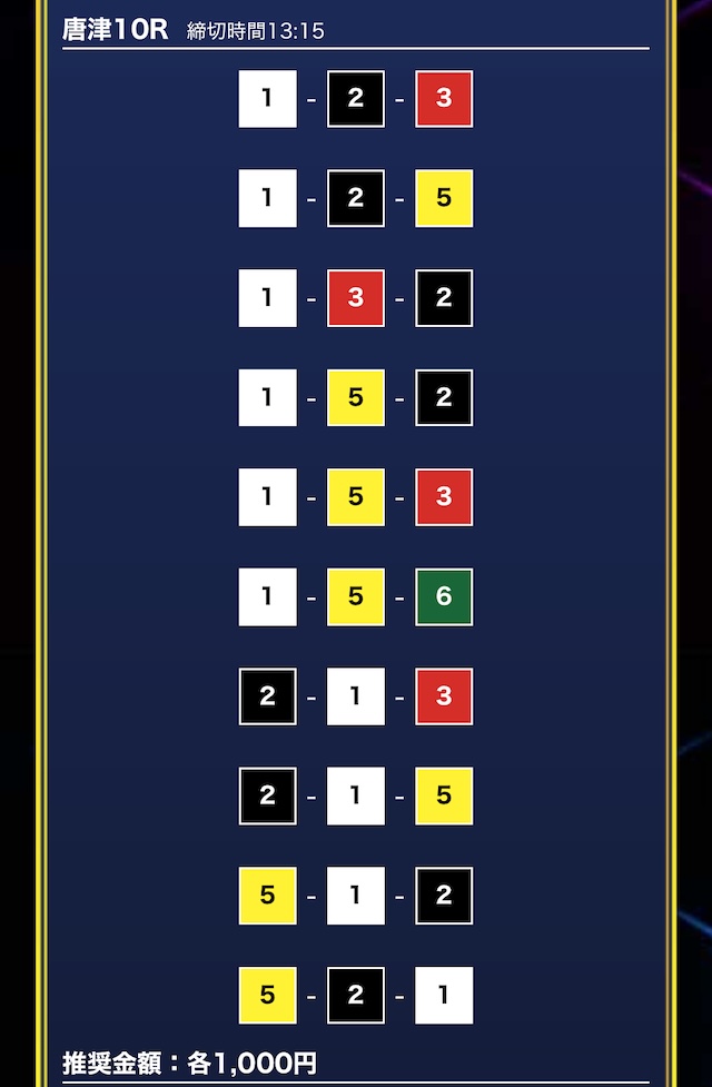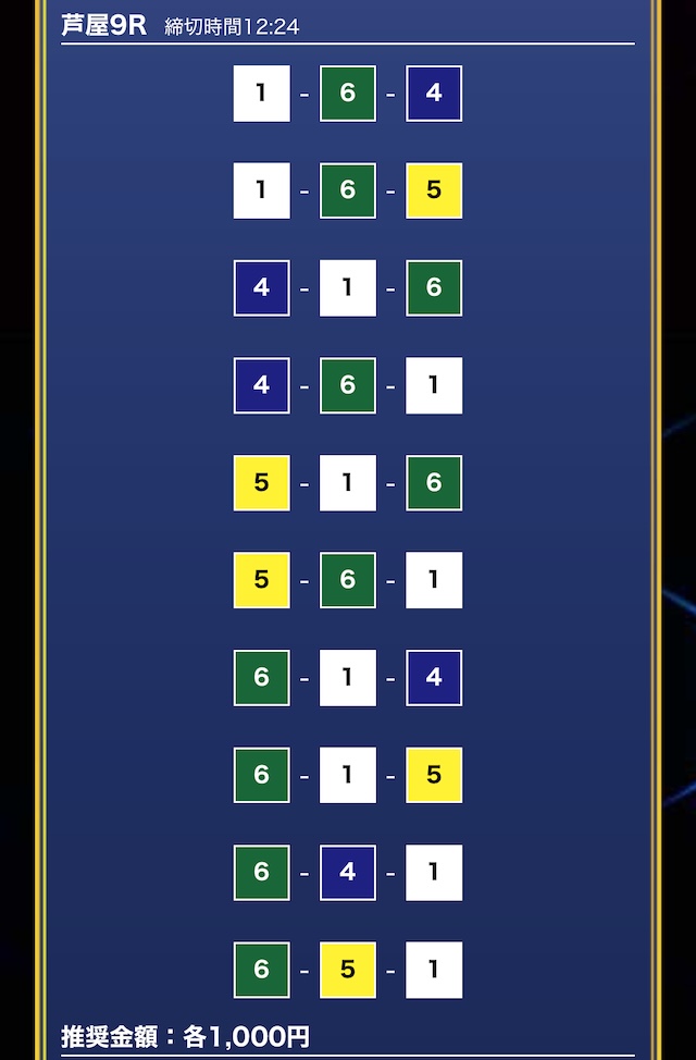 6月22日 | 福岡12R | 三連単 | 10点 | 12,900円 |