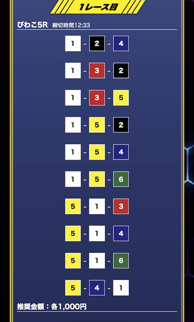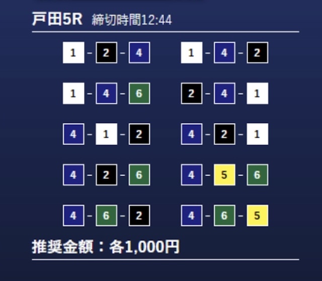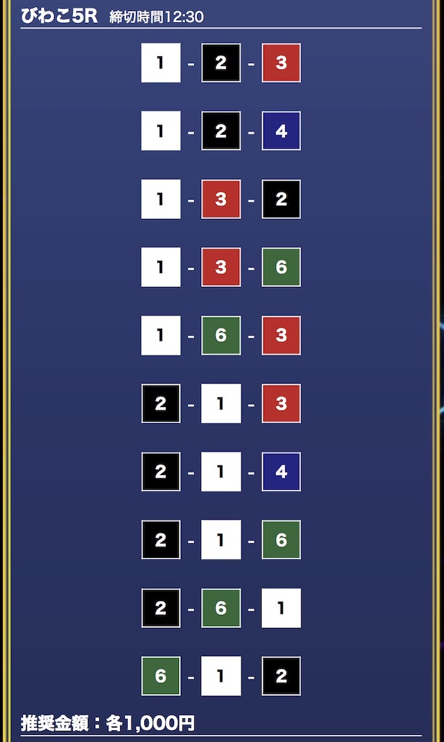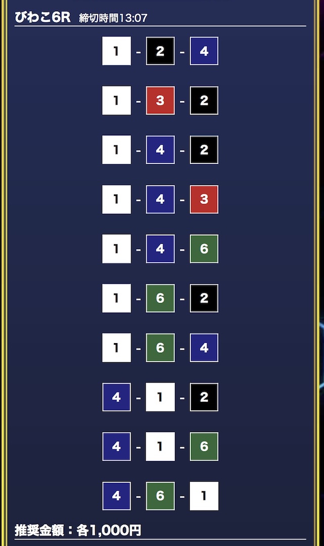 7月1日 | びわこ5R | 三連単 | 10点 | 11,600円 |