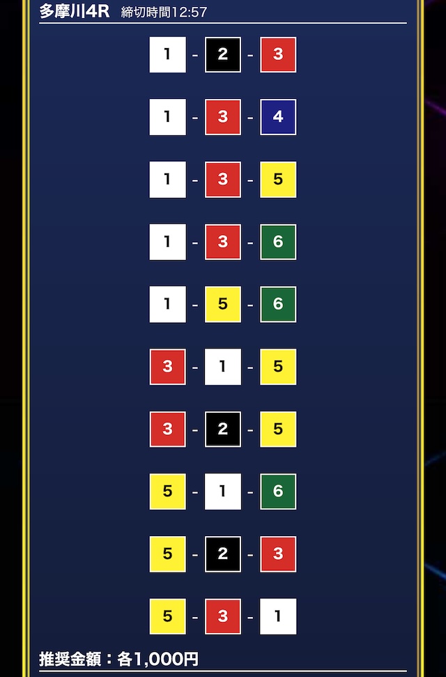 6月17日 | 多摩川12R | 三連単 | 10点 | 16,600円 |