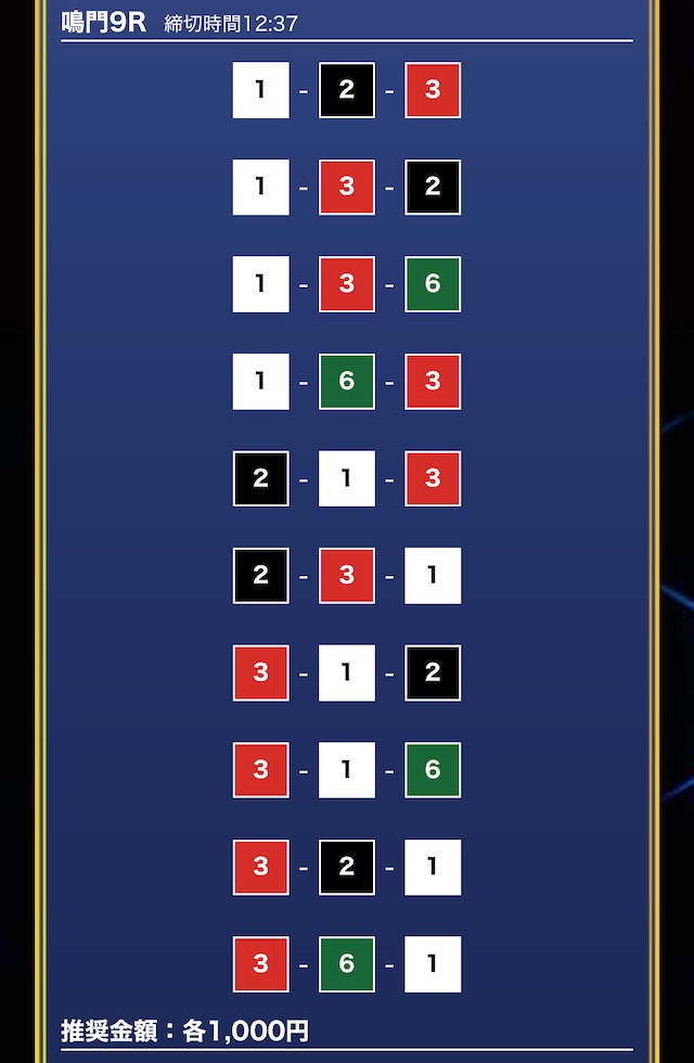6月7日 | 鳴門10R | 三連単 | 10点 | 12,600円 |