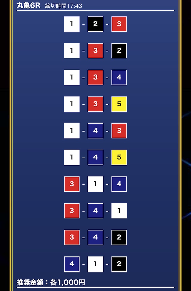 9月4日 | 丸亀6R | 三連単 | 10点 | 12,800円 |