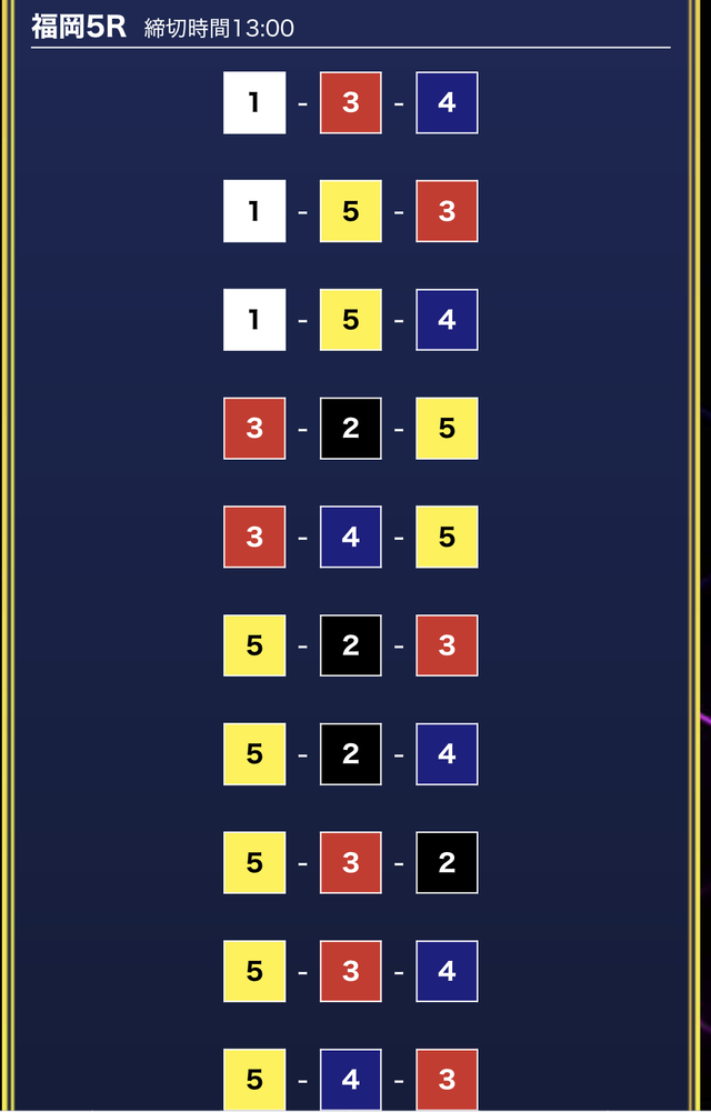 | 12月5日 | 福岡5R | 三連単 | 10点 | 14,900円 |