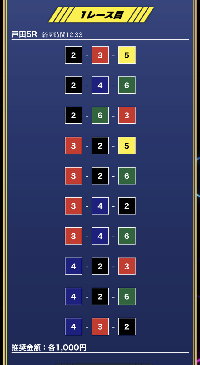 | 1月6日 | 戸田5R | 三連単 | 10点 | 45,000円 |