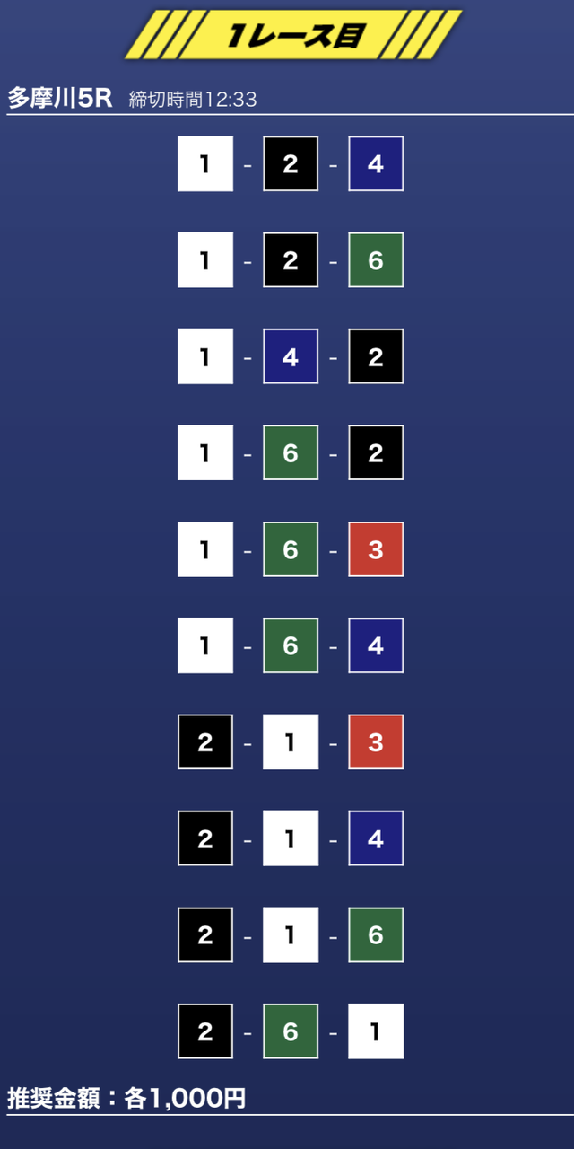 | 1月7日 | 多摩川5R | 三連単 | 10点 | 18,600円 |