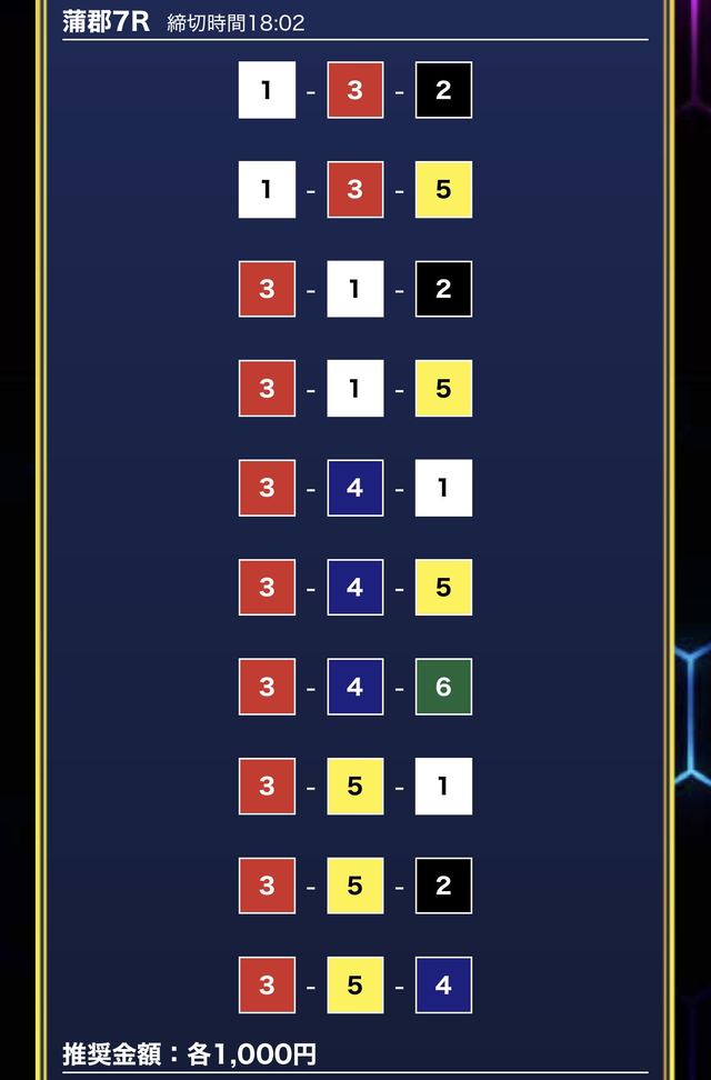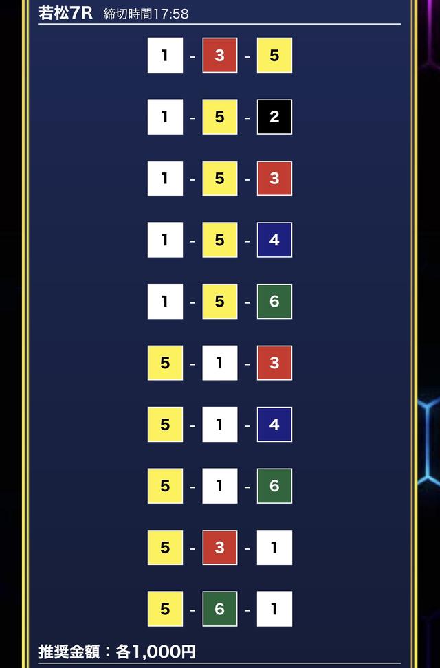 | 12月6日 | 若松7R | 三連単 | 10点 | 110,000円 |