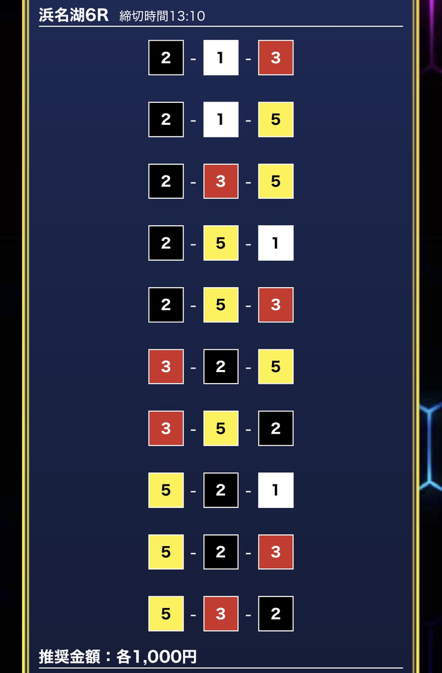 | 11月28日 | 浜名湖6R | 三連単 | 10点 | 21,500円 |
