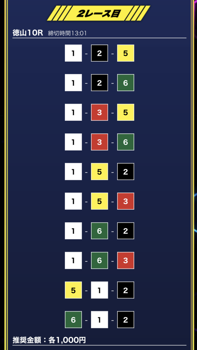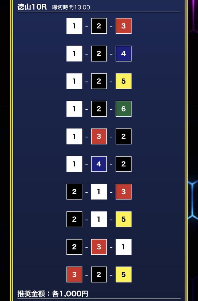 | 10月7日 | 徳山10R | 三連単 | 10点 | 34,000円 |