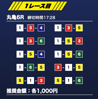 | 9月30日 | 丸亀6R | 三連単 | 10点 | 13,200円 |