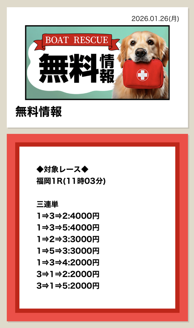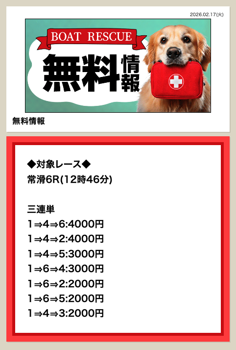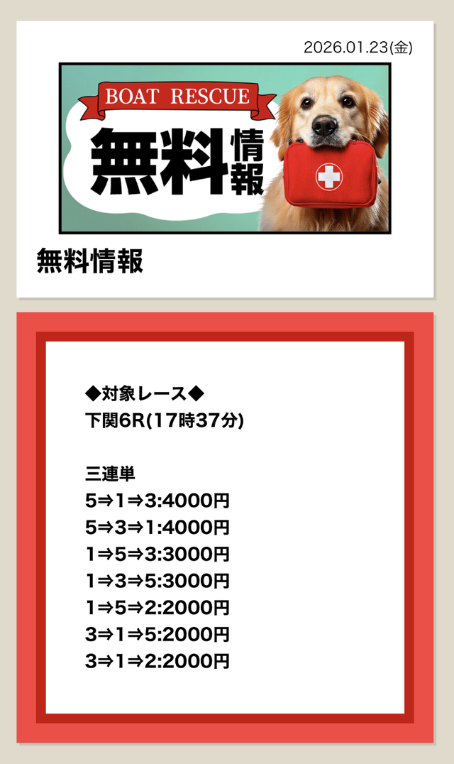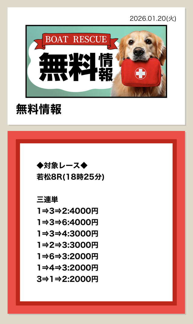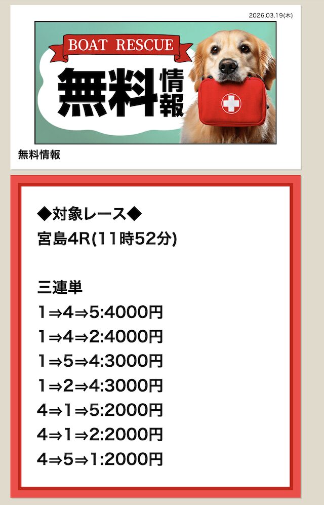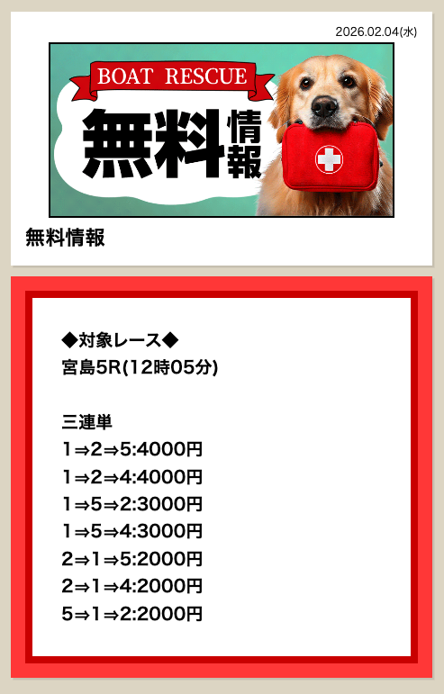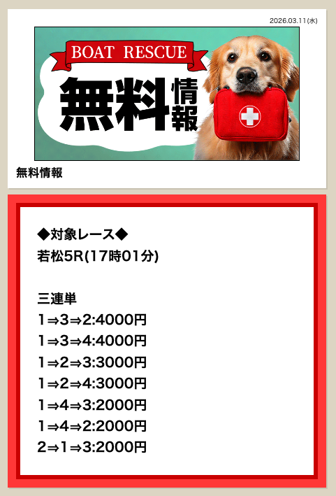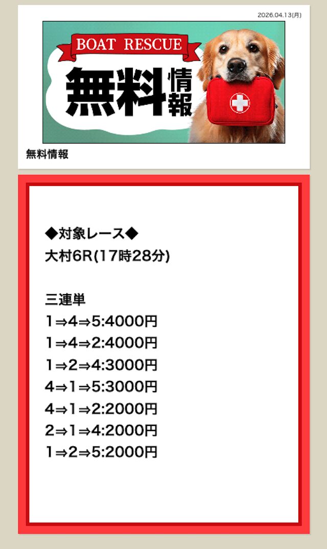 ボートレスキューの有料予想「舟券クリニック/困ったときの処方箋」の最新の結果を共有します。