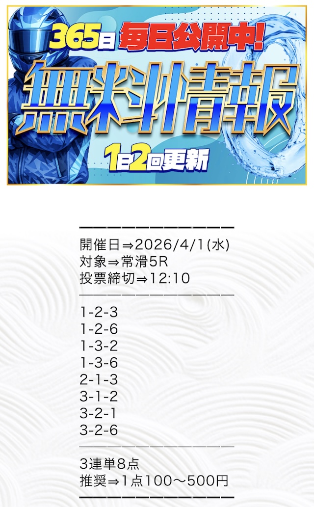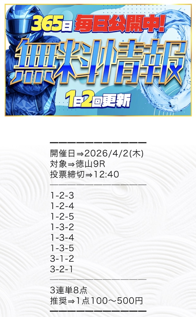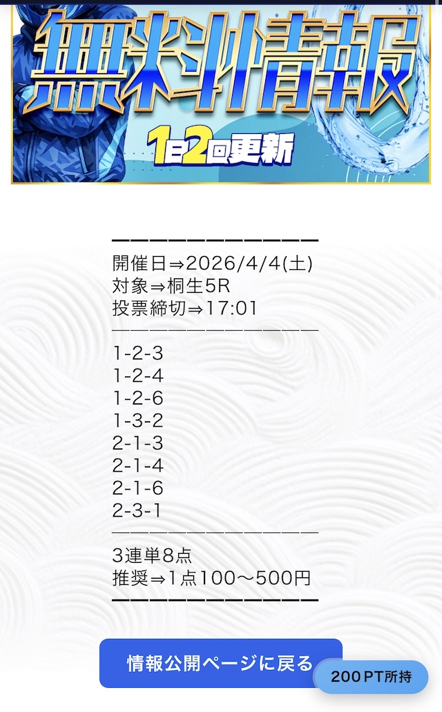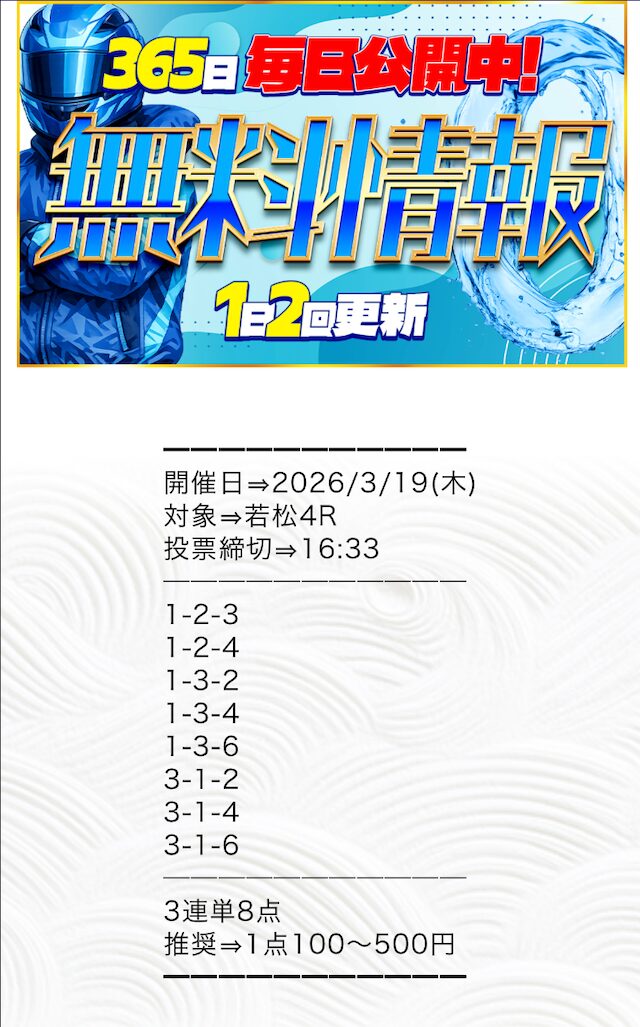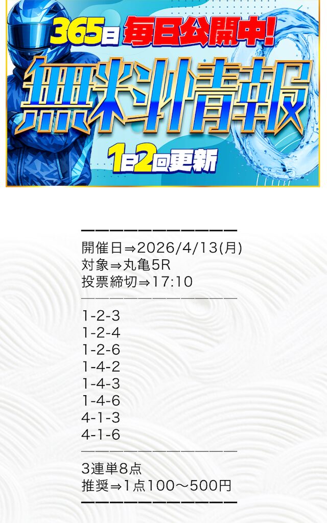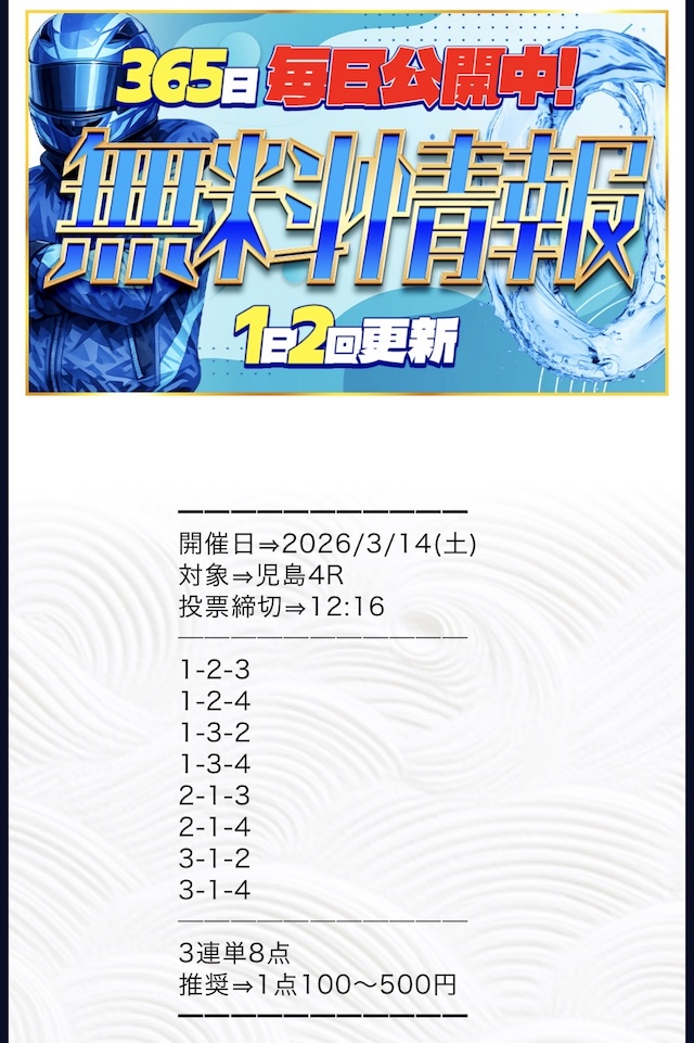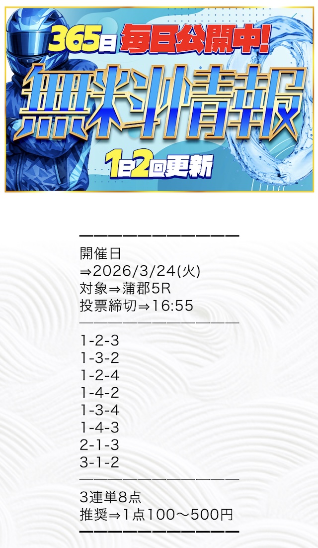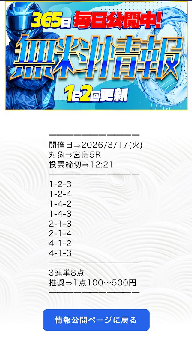 推奨投資金額は1点100円〜500円と、他の競艇予想サイトと比較してもかなり少額に設定されています。