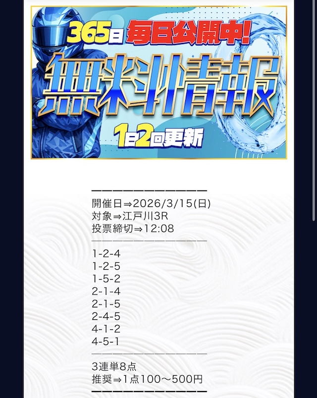 - 「住之江競艇」など、高配当の妙味が薄い会場の予想は見送り、軍資金を温存する。