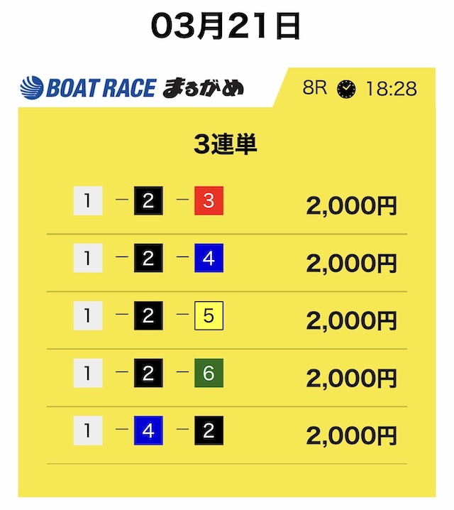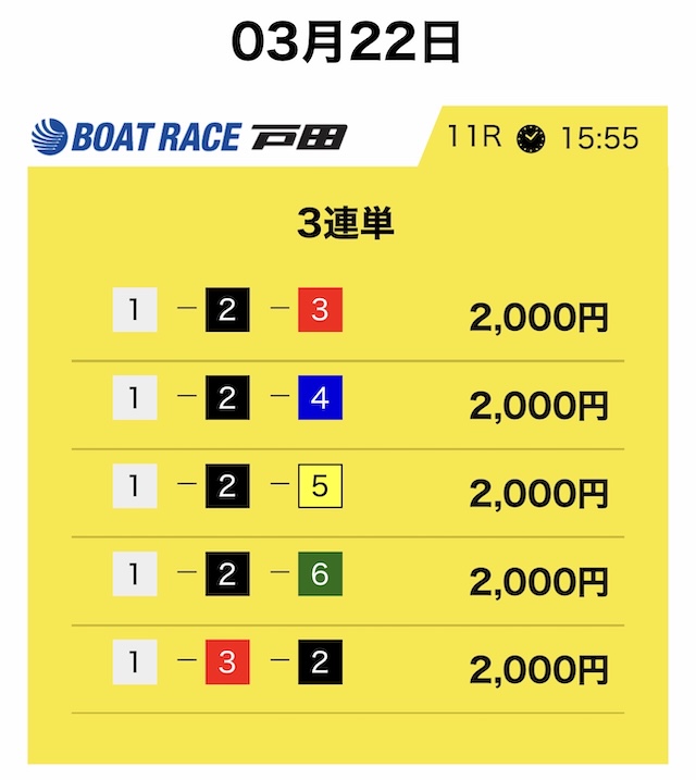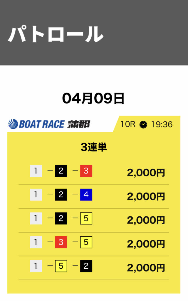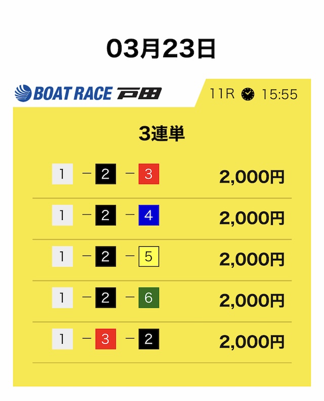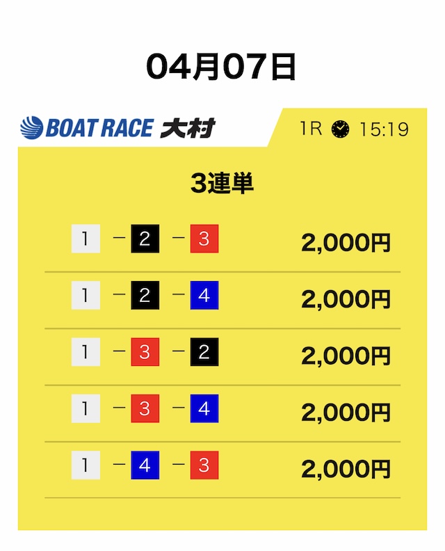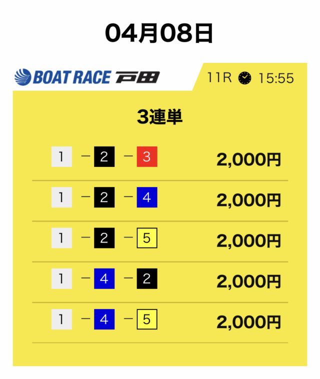 競艇サバイバーは3連単5点・合計10,000円という形が基本です。