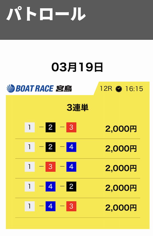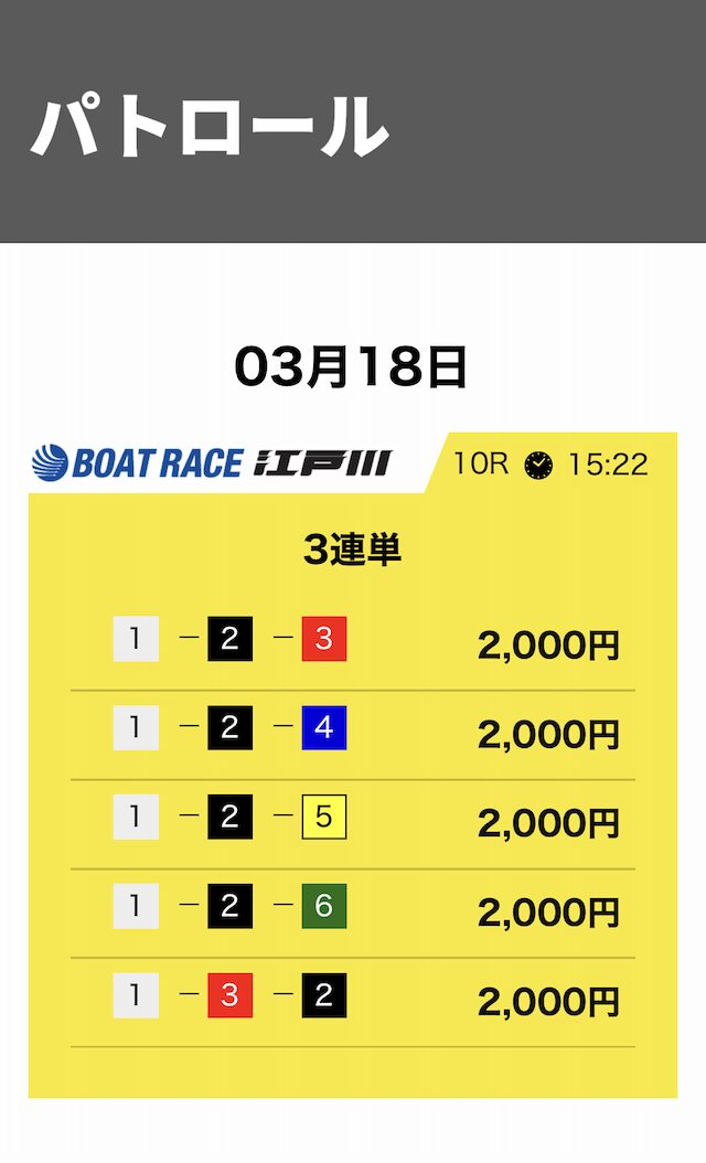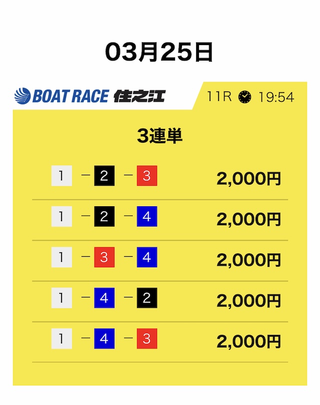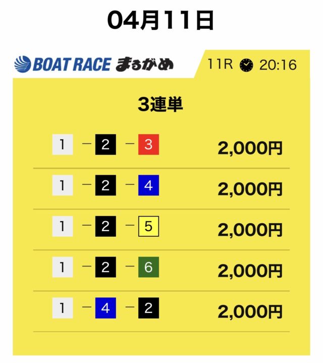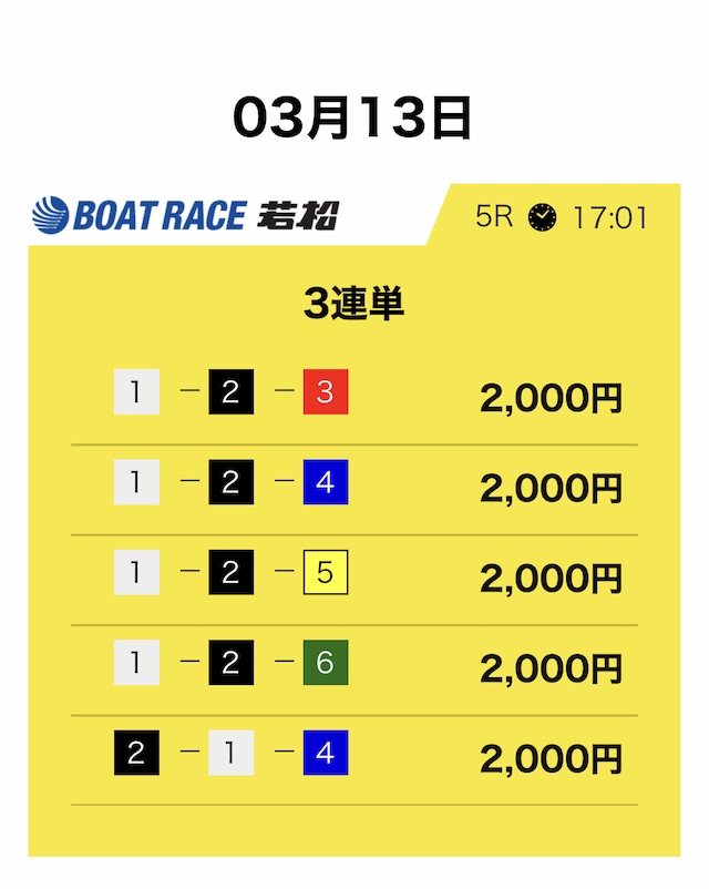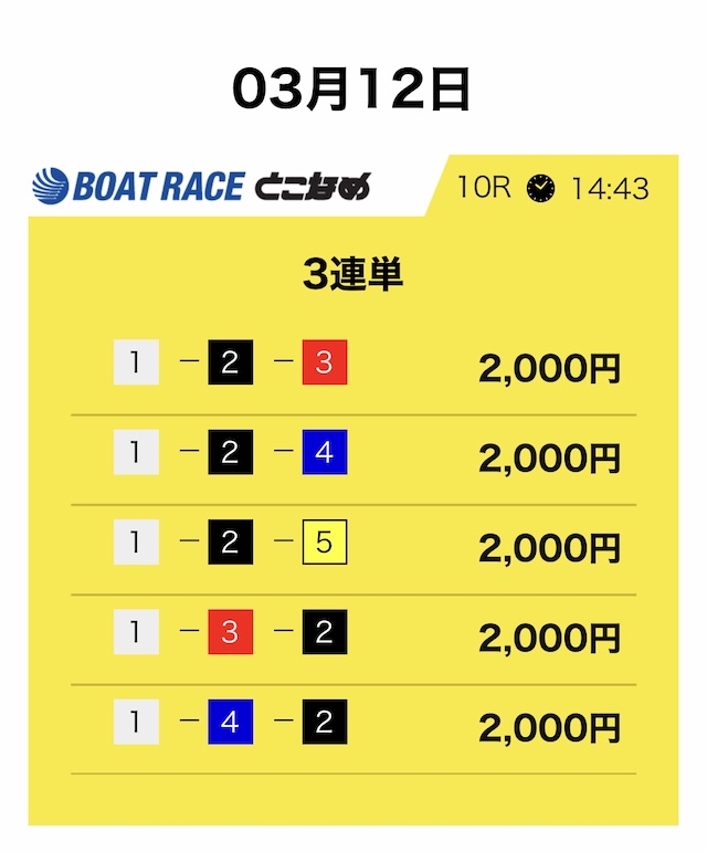 競艇サバイバーは3連単5点・合計10,000円という形が基本です。