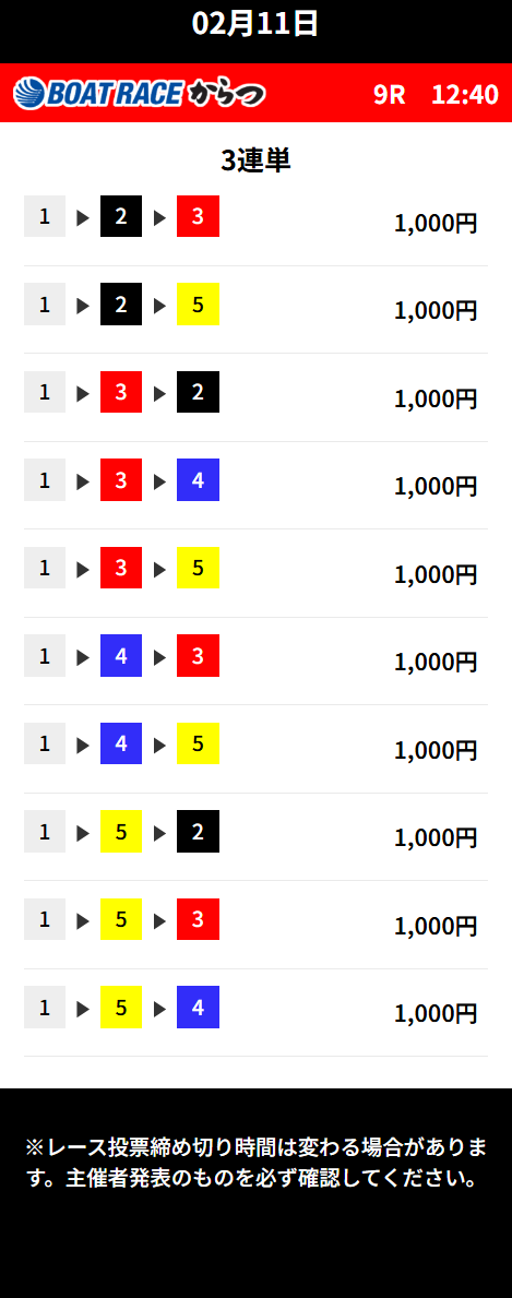 | 26年2月10日 | 唐津8R | 三連単 | 10点 | 13,700円 |