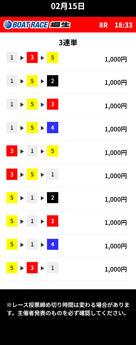 | 26年2月3日 | 江戸川3R | 三連単 | 10点 | 21,500円 |