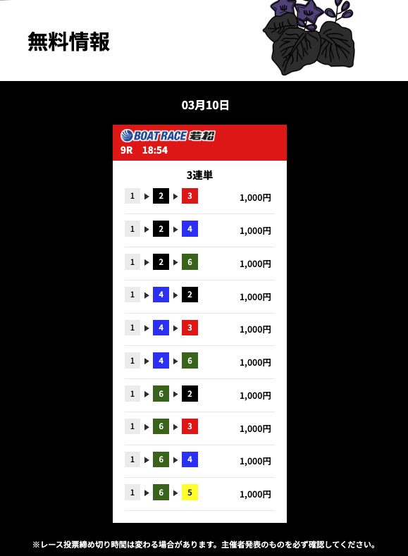 | 26年3月5日 | 若松4R | 三連単 | 10点 | 12,000円 |