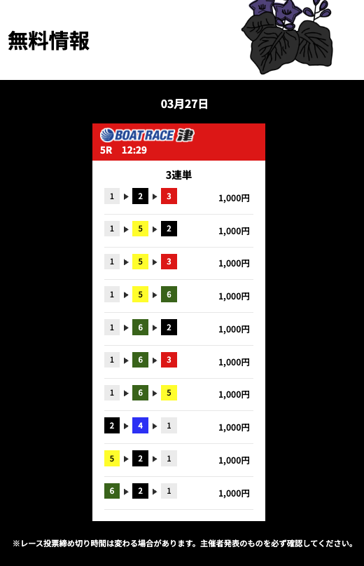 | 26年3月27日 | 津5R | 三連単 | 10点 | 0円 |