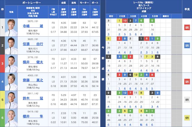 | 枠番 | 選手 | コース | モーター | 勝率 |
