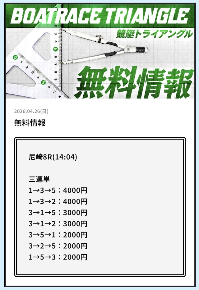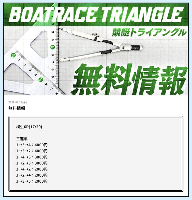 では、競艇トライアングルの予想を見てみましょう。