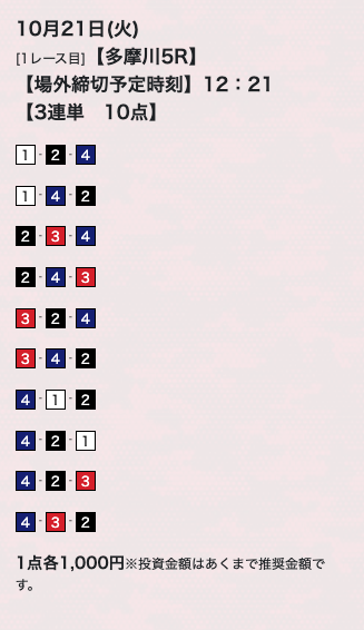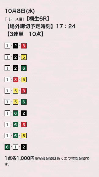 | 10月8日 | 桐生6R | 三連単 | 10点 | 18,700円 |