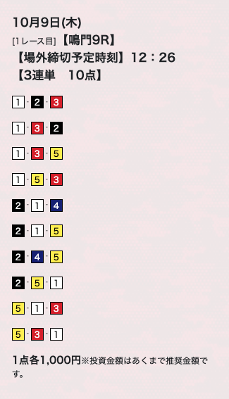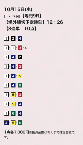 | 10月15日 | 鳴門9R | 三連単 | 10点 | 12,900円 |