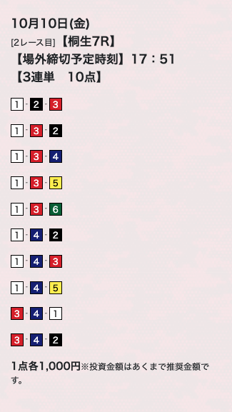 | 10月10日 | 桐生7R | 三連単 | 10点 | 13,100円 |