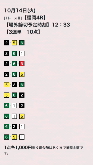 | 10月1日 | 福岡5R | 三連単 | 10点 | 36,000円 |