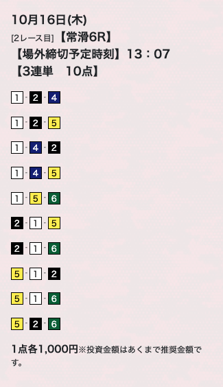 | 10月16日 | 常滑6R | 三連単 | 10点 | 20,100円 |