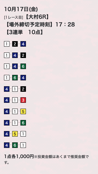 | 10月17日 | 大村6R | 三連単 | 10点 | 10,100円 |