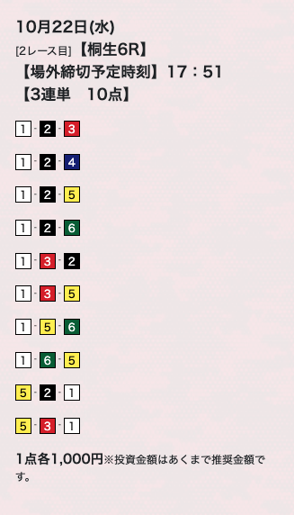 | 10月22日 | 桐生6R | 三連単 | 10点 | 10,200円 |